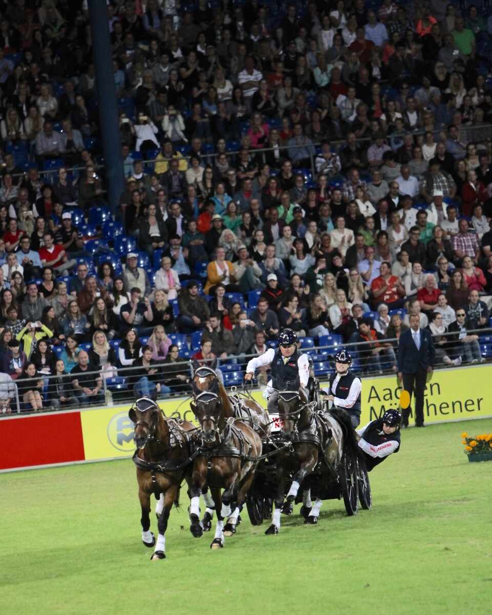 HUGH: Yes. The World Cup has really taken off in that time frame. You are getting full houses now at those shows. The Jump & Drive at CHIO Aachen this year in the main arena also attracted huge crowds. [A three-phase relay that involves a four-in-hand carriage, an eventer and a showjumper, this year’s Jump & Drive was won by Boyd Exell, fellow Aussie Andrew Hoy and Swede Fredrik Spetz. If you look closely at the videos, you’ll see Hugh on the carriage as well!]