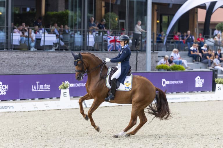 Second in the CDI-W Grand Prix Freestyle this evening was Wendi Williamson of New Zealand with Don Vito MH, with the pair only a fraction behind Mary and Ivanhoe on a score of 76.35%. It was an incredibly close top three, with David McKinnon and Estupendo scoring 75.550%.