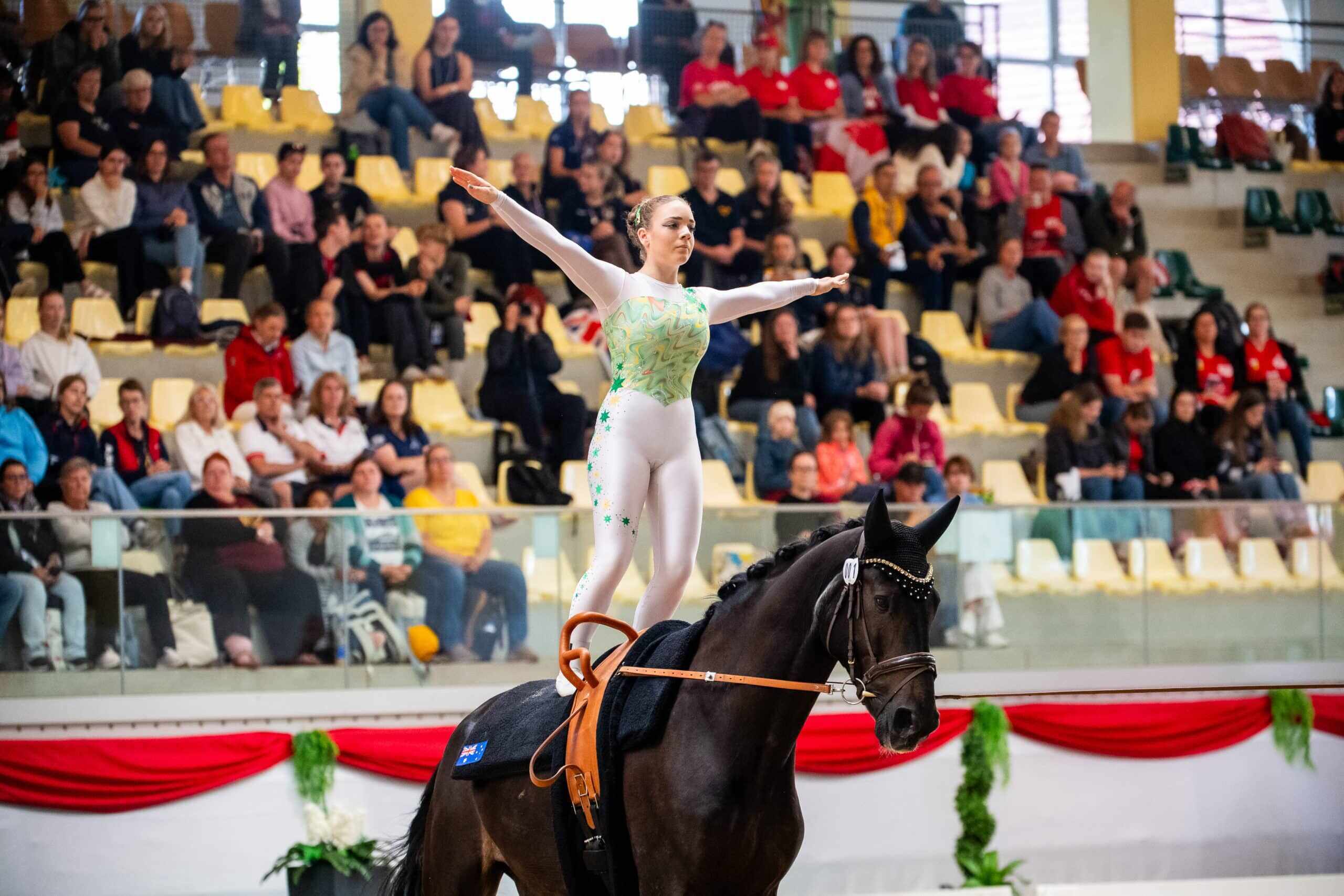 Partnered with horse Eldorado 139 and German lunger Sophie Kuhn for the championship, 17-year-old Sahara Weil was awarded 6.617 in the Compulsory Test and 6.081 in the Free Test. This gave the young Australian, who has been vaulting since the age of ten, an average of 6.349 – and while this wasn’t quite enough to progress to the final, it was an admirable score to have produced on the world stage.