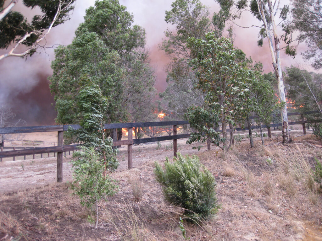 Our experience of the Black Saturday fires of 2009 was rather severe. When the Australian Equine Behaviour Centre was at Clonbinane, we were right next to Kinglake National Park and only about an hour north of Melbourne. The fire began eight kilometers to our west and the front passed through the middle of the property, about 50 metres from our house and 150 metres from our stables and indoor arena. Then it went to Kinglake and Marysville south-east of us, before turning in the afternoon when the winds changed and it came hurtling back toward us as a much bigger fire. My son Warwick and I were stuck in NSW so Manuela and the AEBC team had to deal with the majority of the fire themselves. We had a good fire plan as we had a few close shaves in earlier years. Warwick and I finally got home at the tail end of the afternoon fire despite the police refusing to let us get home and barricading our road. It was extraordinary driving through the unrecognisable road, over fallen powerlines and trees still burning.