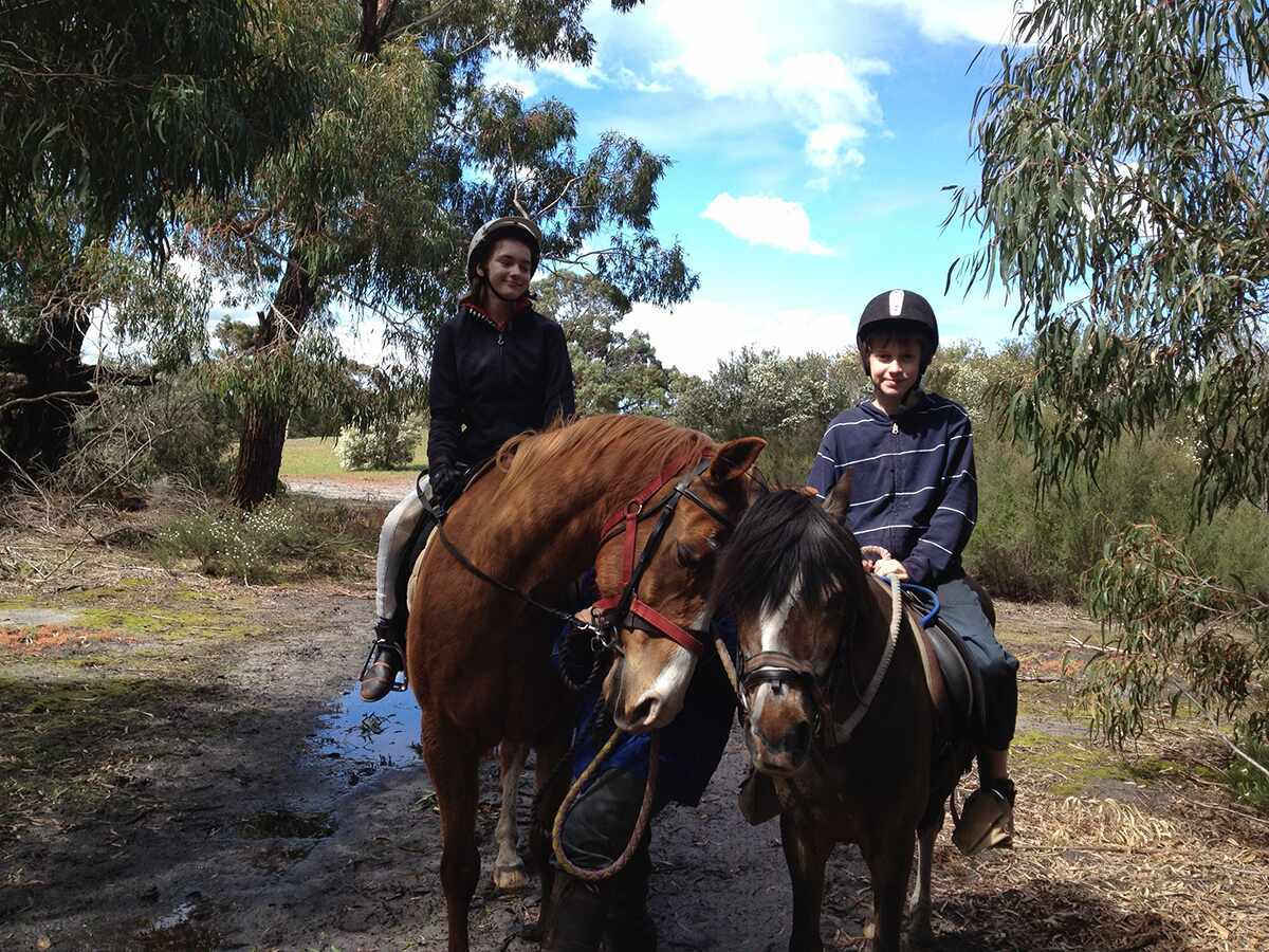 Stella began riding with Sally Francis at Tooradin in 2013. In the first image, she is pictured on a trail ride with her brother Curtis and Sally’s horse Mossie; in the second image, Stella is competing at the 2014 RDA Nationals on another of Sally’s horses, Coriander. Images supplied.