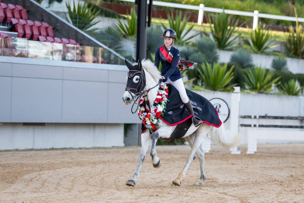 Olivia Curtain with Ngahiwi Lady Blu winning the Children’s Spectacular at Willinga Parks 4CYTE Jumping@Willinga. Image by Simon Scully Photography.
