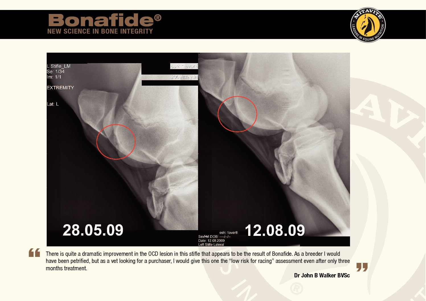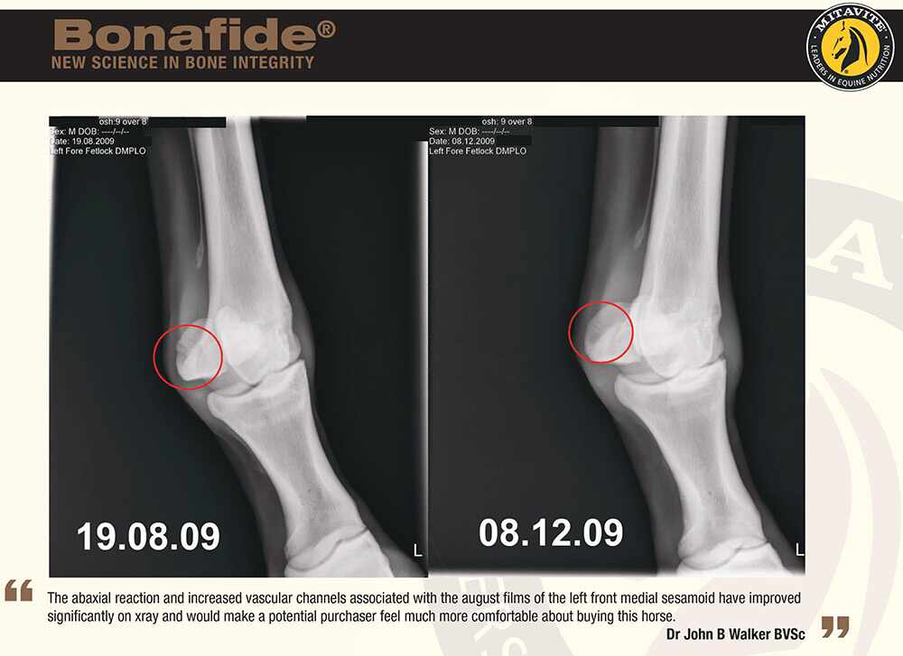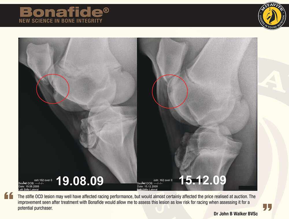 A study was conducted on presale thoroughbred yearlings, who were treated with 20g of Bonafide per day between the X-ray dates. The results showed marked improvement and in all cases eliminated the need for surgery.
