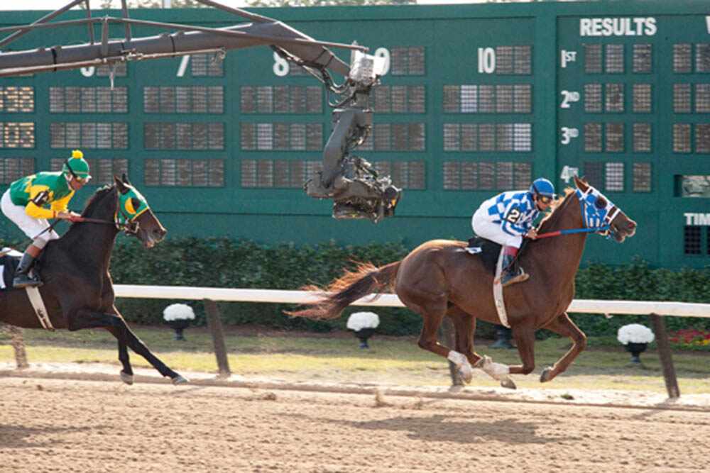 Semler was very proud of a slow-motion sequence at the winning post. “In real time it was no longer than a half-second, but in slomo it was 30. You see every muscle, every hair. There’s one moment, just as he crosses that line, where he’s airborne — all four legs off the ground! We did only two takes. It’s just spectacular!”